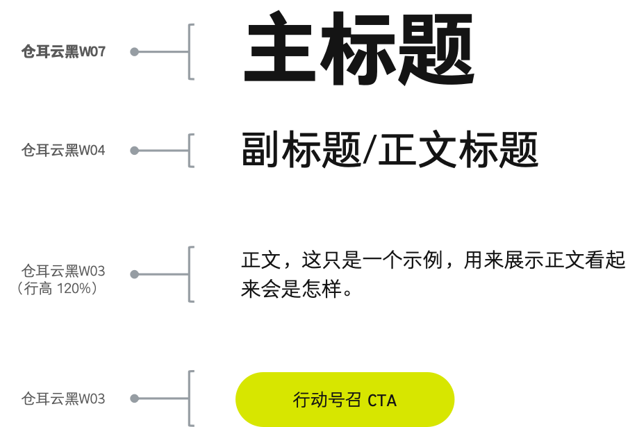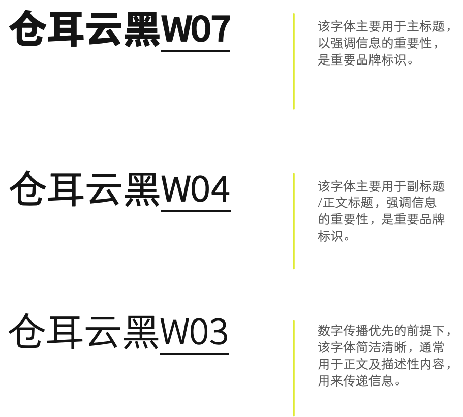 “仓耳云黑W07” is our primary signature typeface. “仓耳云黑W04,” being relatively lighter, serves to support main headlines. For body text, where readability and clarity are the top priorities, please use “仓耳云黑W03.”